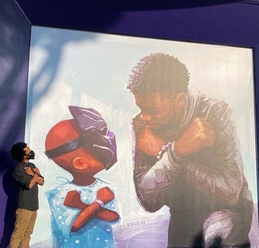 You may recognize him from his work on the “King Chad” mural, which honored Black Panther star Chadwick Boseman. This mural was placed in Downtown Disney at the Disneyland Resort in 2020. It is now on permanent display in the Children’s Hospital Los Angeles.