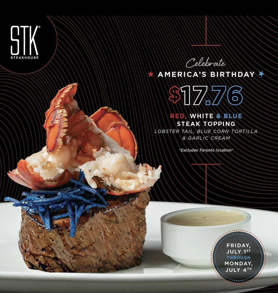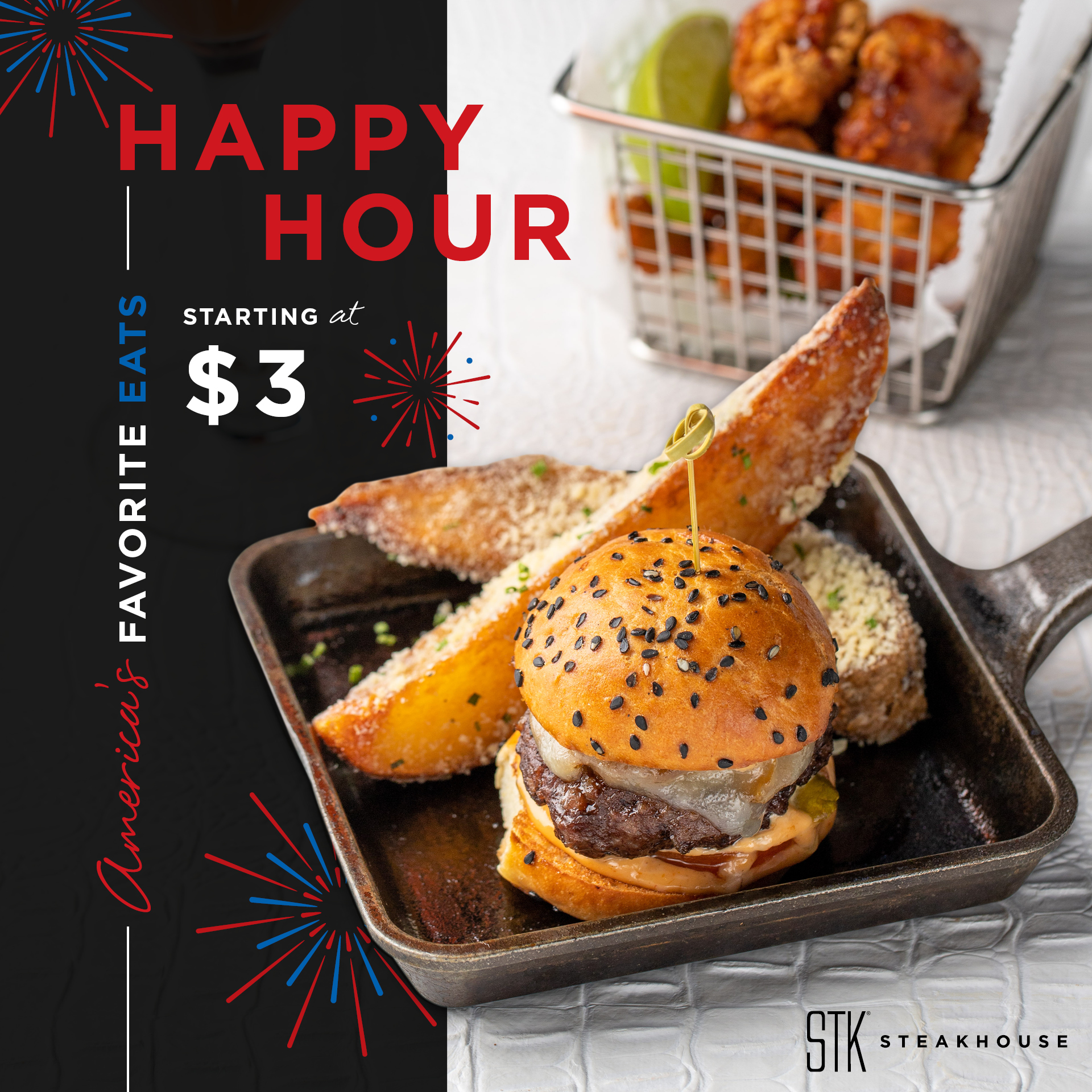 STK hosts Happy Hour from Monday to Friday from 3PM to 6:30PM, and for a limited time they’re hosting a Fourth of July-themed Happy Hour. This event calls for prices ranging from $3 to $9 on drinks and select menu items. In addition to the special Happy Hour eats, there’s a NEW Red, White, and Blue Lobster Topping available!