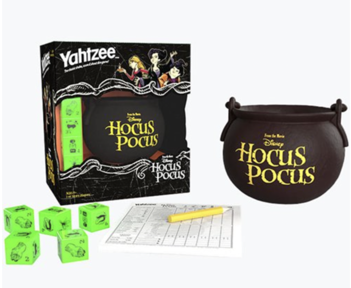 Finally, we have Hocus Pocus Yahtzee! This is a twist on the classic Yahtzee dice game inspired by Hocus Pocus, where players get to “shake, roll, and shout” spells and ingredients from Winifred Sanderson’s evil book to create winning combinations.