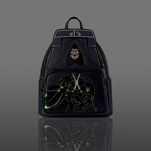 Let’s start this list out with some NEW bags! First up, a glow-in-the-dark Star Wars backpack landed on Amazon this week. The Darth Sidious Villains Scene Loungefly Backpack is available for pre-order now for $71.11. The black design features a menacing cutout of Darth Sidious above an image of Luke Skywalker and Darth Vader dueling with lightsabers. But perhaps the coolest feature is the glowing lightning design on the straps!