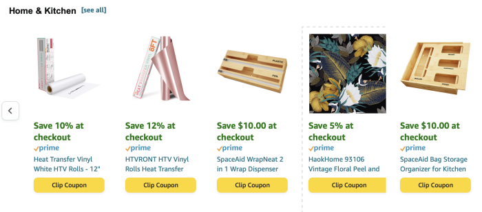 You must be an Amazon Prime Member to access these savings, but as you can see there’s a variety of savings types available, from 5% off all the way to $10 off. All you have to do is “clip the coupon” on the item you want (or as many as you want!), and you can then add it to your cart where the offer is automatically applied.