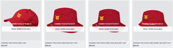 The collection showcases Eeyore, Pooh, and Piglet! Each character’s set of hats ranges from $40-$55, and includes a baseball cap, bucket hat, kid’s bucket hat, and baby’s bucket hat.