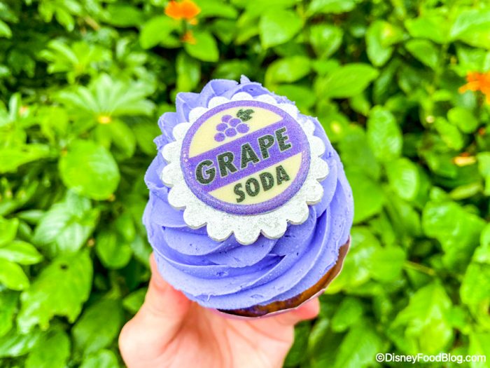 First up is an exciting food update for you! The Grape Soda Badge Cupcake that we tried last year has returned to Animal Kingdom. This cupcake first appeared in 2021 with several other badge-themed cupcakes.