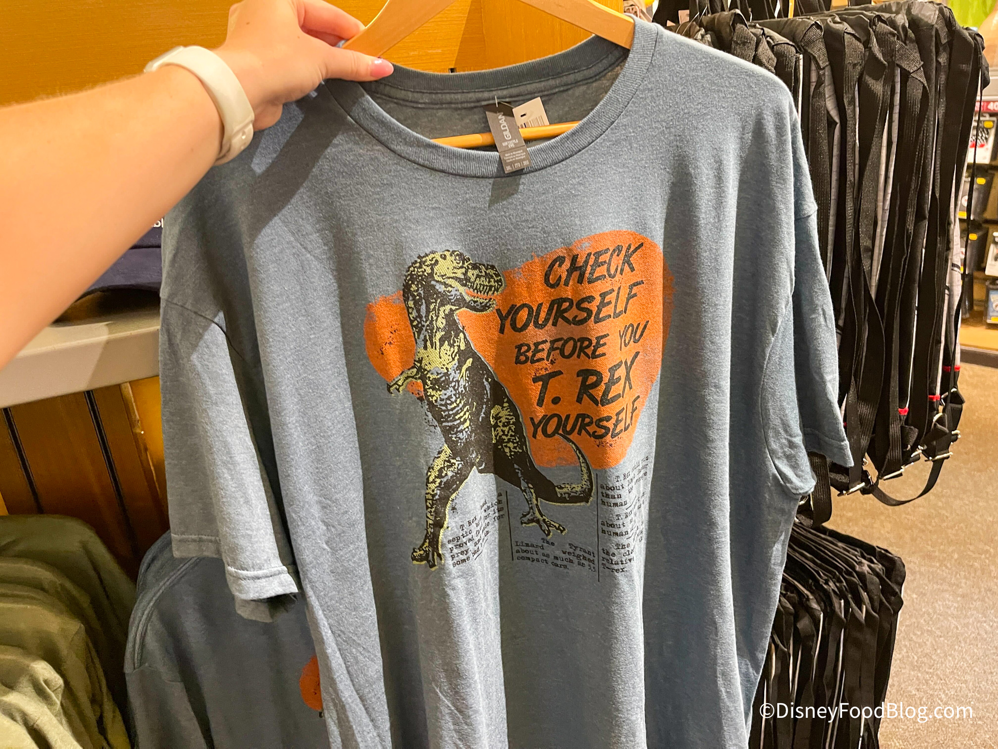 And we found this shirt that also has a T-Rex on it and says “Check yourself before you T-Rex yourself.” Get it? 😂