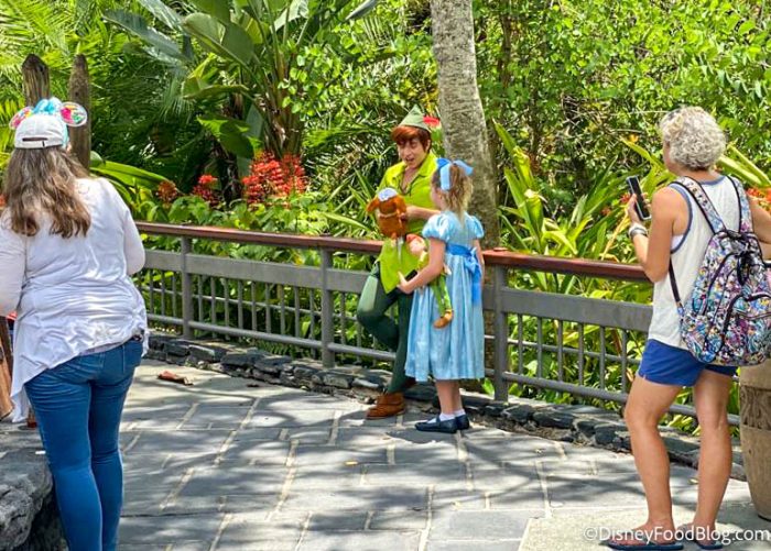 Later in the afternoon, we spotted Peter Pan over in Adventureland, next to Bwana Bob’s, across from the Sunshine Tree Terrace. At that point, his meet-and-greet was a little less run-intensive! Instead, a line had formed to meet Peter…