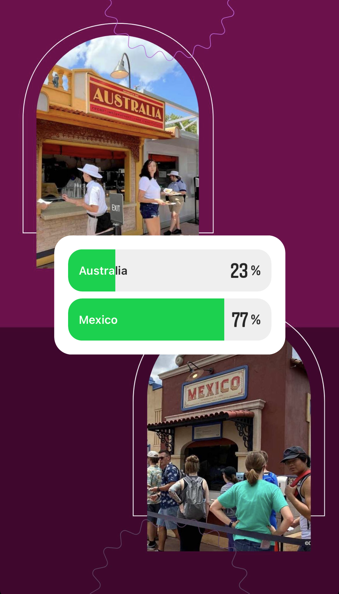 First up, we had Australia vs. Mexico! This seemed to be a pretty easy decision for our readers, as Mexico won with 77% of the votes. Australia fell behind with only 23% of the votes. Mexico’s booth can have very long lines, so it isn’t too shocking that it came out on top.