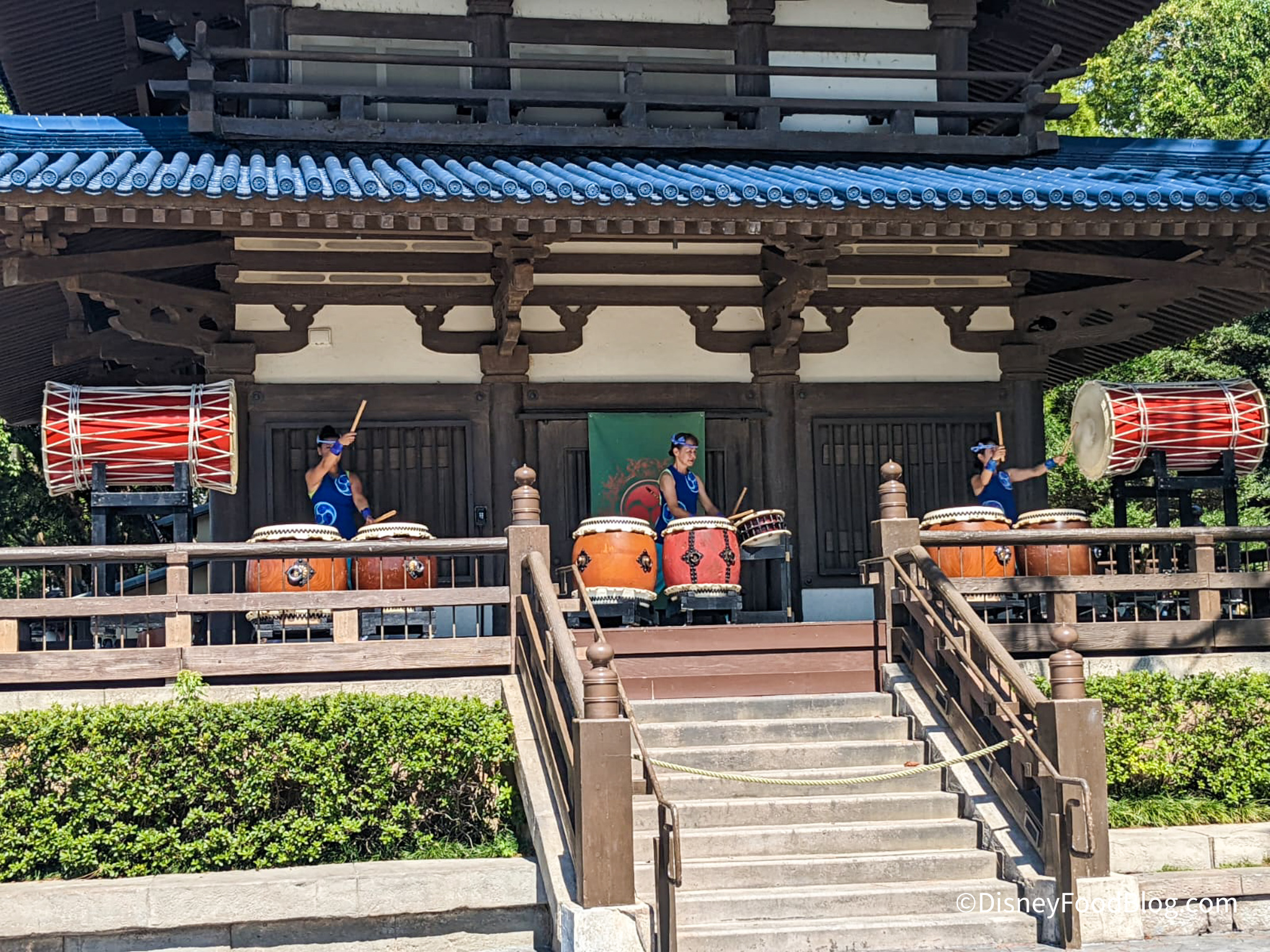 Over in the Japan pavilion, we saw the iconic Matsuriza drummers! They were playing their massive drums in the shade of one of the buildings in the pavilion. This entertainment offering is not exclusive to the Food and Wine Festival, and you can catch these drummers most days about once per hour.