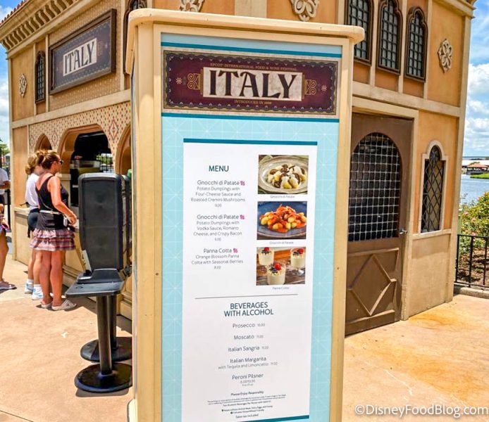 The Italy booth is located in the Italy pavilion in EPCOT’s World Showcase (shocking, right?!😉). There are a variety of new items at the booth this year, from pasta dishes to Panna Cotta, and some returning favorites, like the Italian Margarita!