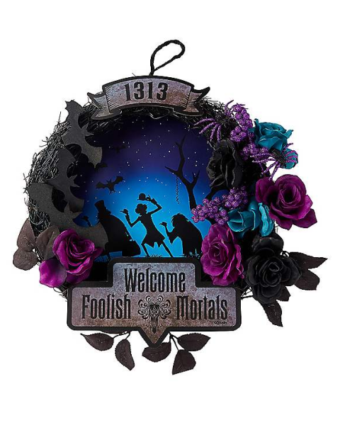 Let’s start at the front door, of course. Add some chilling fun to your entryway with the Welcome Foolish Mortals Wreath for $39.99. Did we mention that it lights up?!