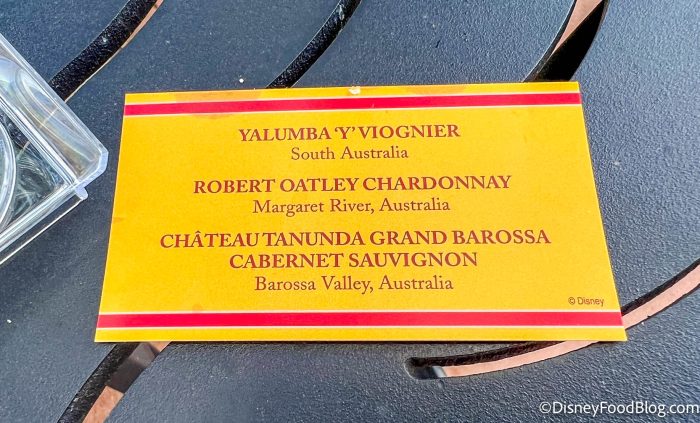 Our flight came with the Yalumba ‘Y’ Viognier, the Robert Oatley Chardonnay, and the Chateau Tanunda Grand Barossa Cabernet Sauvignon. (Try saying that three times fast!) Of those three, the Yalumba ‘Y’ Viognier was the only new option. We found it to be quite dry, and by the time we got to drink it, it was incredibly warm from the Florida heat. If you’re interested, you can buy a glass of this wine individually for $6, but it probably wouldn’t have been our personal choice for a hot day in EPCOT.