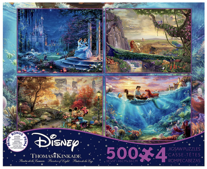 Puzzle fans might want to take a look at the 4-in-1 Thomas Kinkade Disney Dreams Puzzle, which comes with 4 different 500-piece puzzles, including scenes from Cinderella, The Lion King, Mickey and Minnie, and The Little Mermaid.
