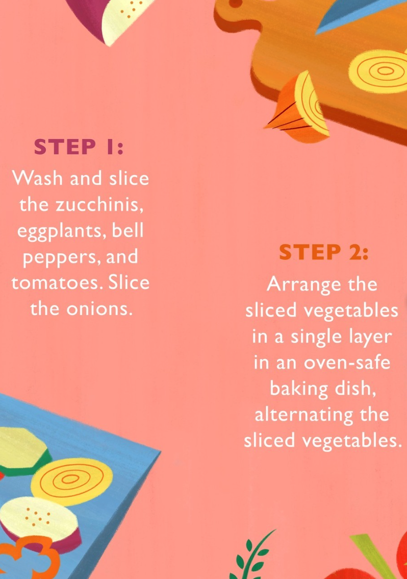 Begin by washing and slicing your zucchinis, eggplants, bell peppers, and tomatoes, and then slice the onions. Then arrange the sliced vegetables in an alternating pattern in a single layer in an oven-safe dish.