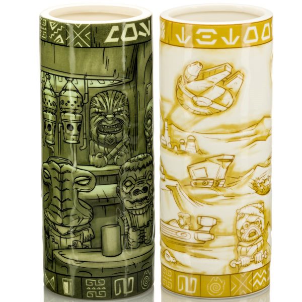 The Star Wars: Episode IV Tiki Mug Bundle features Tattooine and the Mos Eisely Cantina. You’ll spot the Millennium Falcon, among other things, on the Tattooine mug and a host of scum and villainy on the Mos Eisley Cantina mug.
