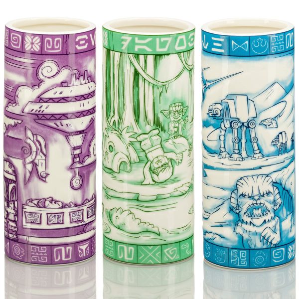 Finally, you can grab the Star Wars: Episode VI Tiki Mug Bundle, which features Jabba’s Palace and Endor. Jabba’s Palace has Jabba the Hutt on it (of course!) and Endor has Ewoks, as well as scenes from the Battle of Endor.