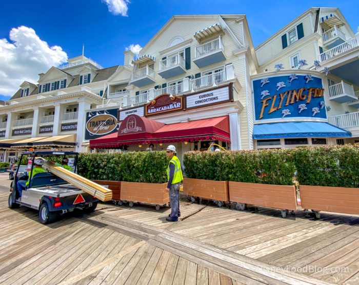 There’s a bit of sidewalk construction taking place on Disney’s BoardWalk. It looks like some of the planks are being replaced in front of Flying Fish and Abracadabar.