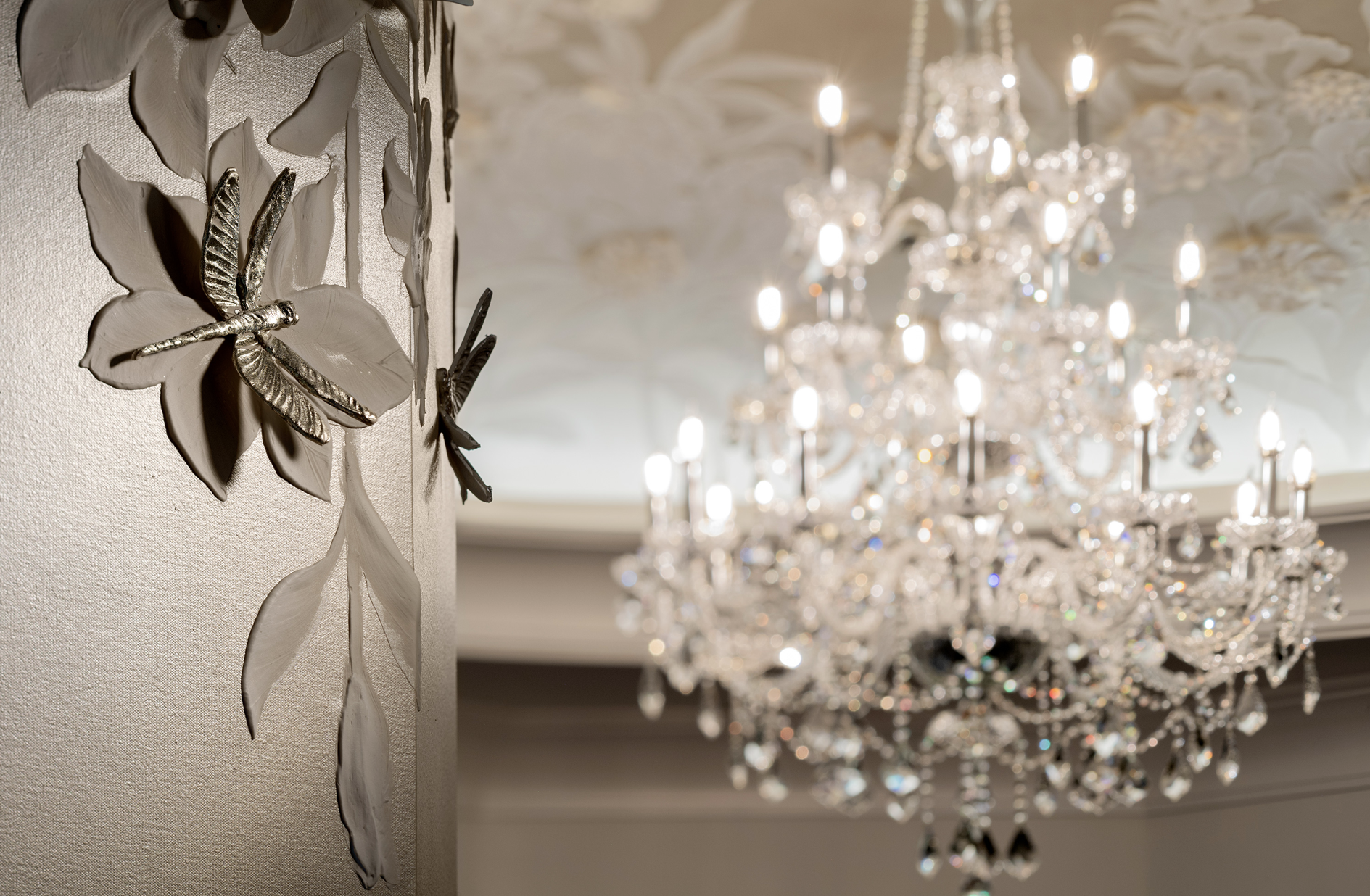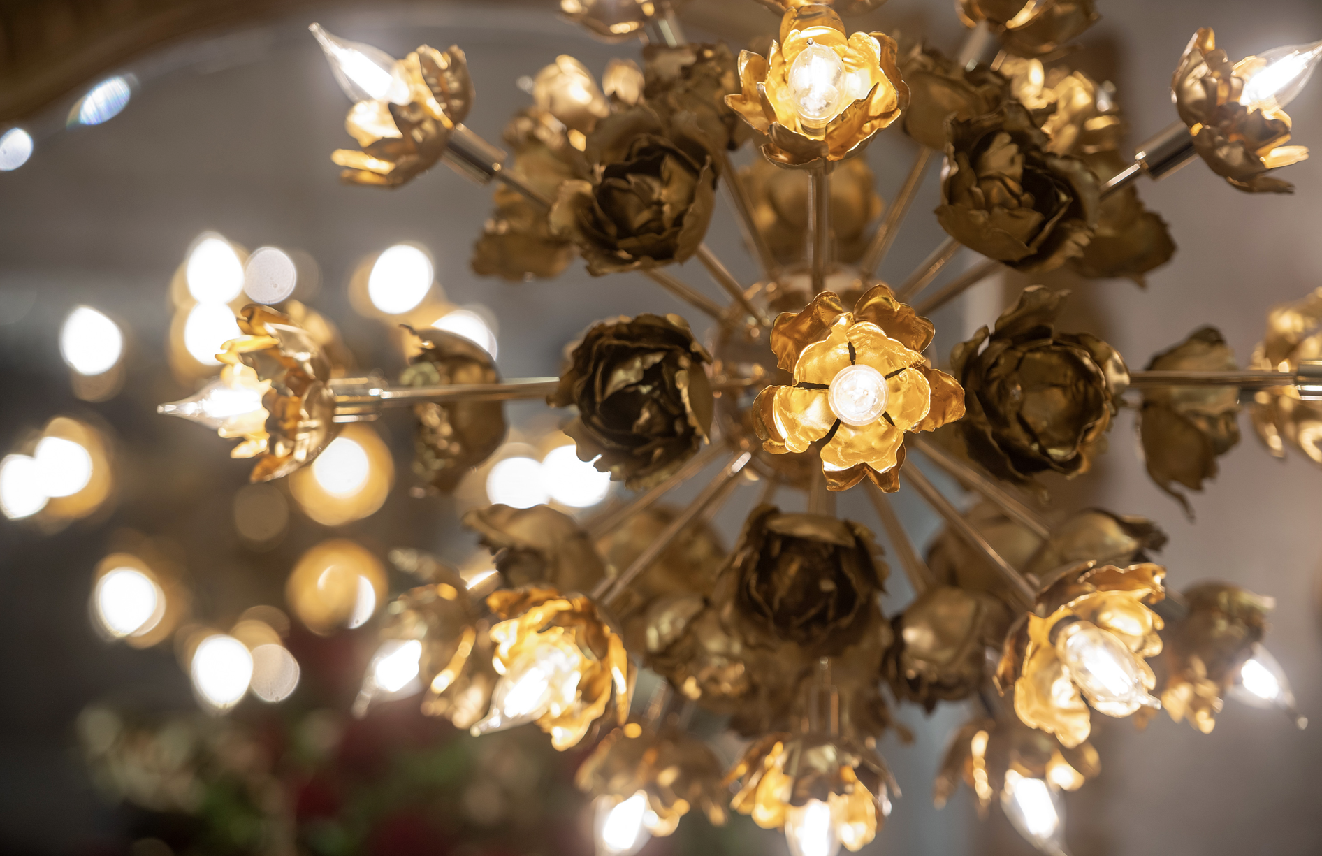 …and here’s what it looks like now! As you can see, there’s new carpet, tables, chairs, and details. You can also see the delicate scroll work around the room.