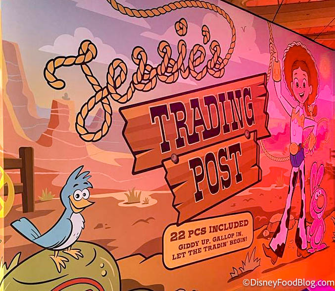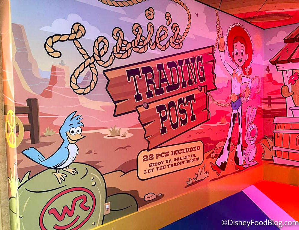 Jessie is holding a rope and the mural says “22 pcs included, giddy up, gallop in, let the tradin’ begin!”