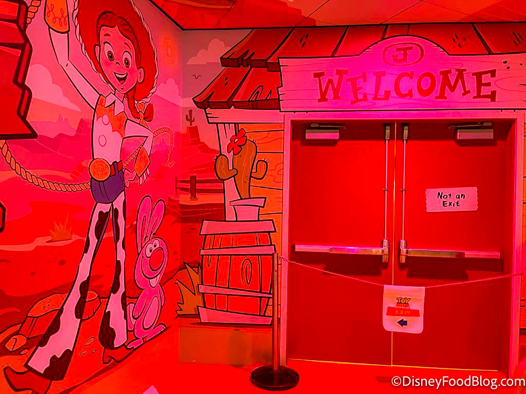 Now Disney just added a big update — there’s a FULL Jessie’s Trading Post mural covering the walls! This mural displays our favorite cowgirl Jessie with some happy animals in a Western setting.