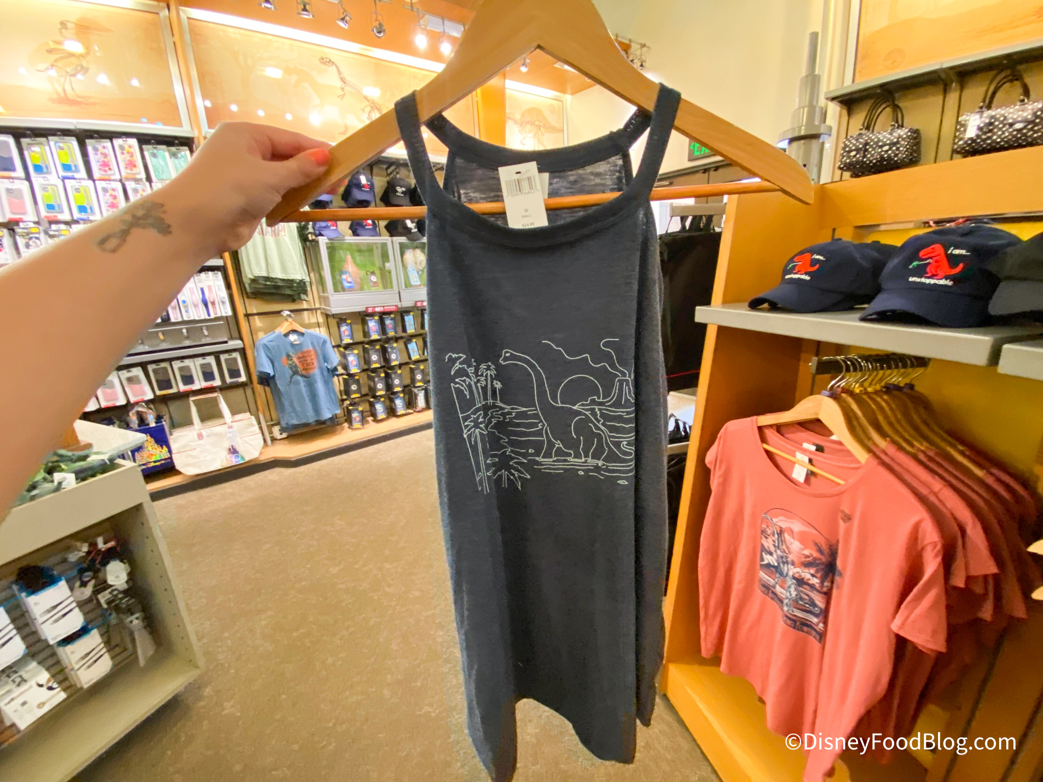 The Dino Institute Shop is the gift shop at the end of the DINOSAUR ride, and we spotted two new items here, as well. First up is this tank top. It has the outline of a dinosaur in front of some water and a volcano in the background. It’s $24.99.