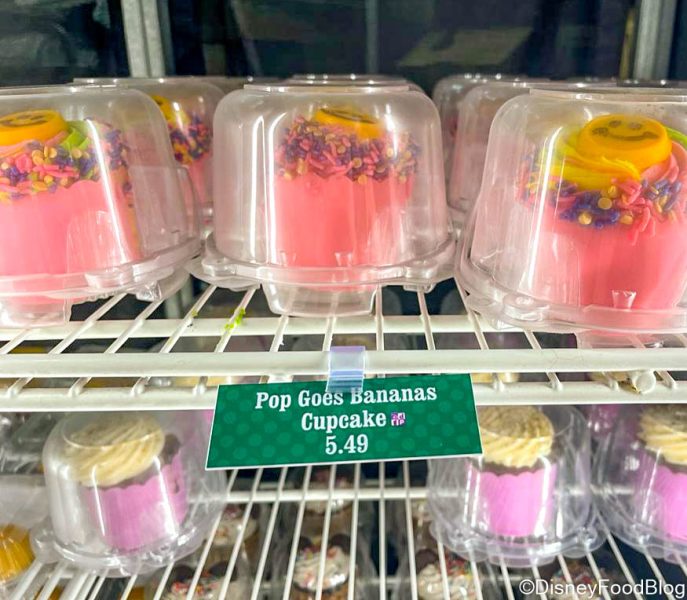 Over at Everything Pop Century Shopping & Dining at Disney’s Pop Century Resort, we tried the Pop Goes Bananas Cupcake! This treat is $5.49, and is a yellow cupcake filled with caramelized banana, pastry crème, caramel-latte buttercream, and a chocolate smiley face medallion. And spoiler alert: banana lovers will go bananas for this one.