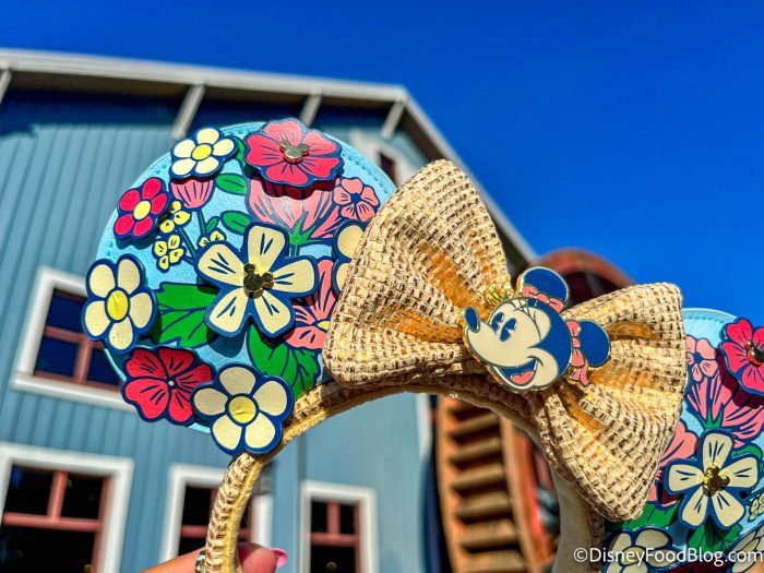 These new ears feature flower-covered blue ears tied together with a beige bow with Minnie on the front!