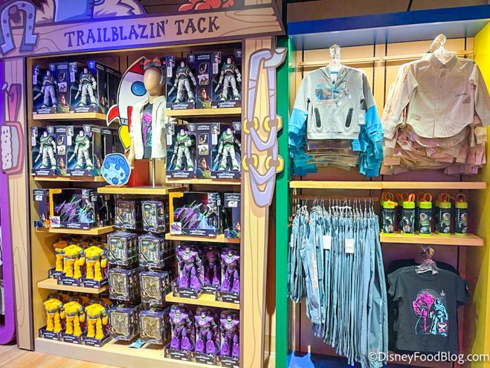 There are also parts of the store that showcase “Trailblazin’ Tack” alongside merchandise of Buzz Lightyear, especially lots of items themed to the new Lightyear movie.