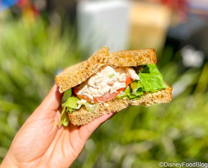 We visited Woody’s Lunch Box over at Disney’s Hollywood Studios to grab the Chicken Salad Sandwich for $10.49. The sandwich is made with chicken salad, lettuce, tomato, and Dijonnaise spread on sunflower multigrain bread. It also comes with a side of potato barrels, tomato soup, or a Cuties mandarin (we chose the potato barrels AKA tater tots).