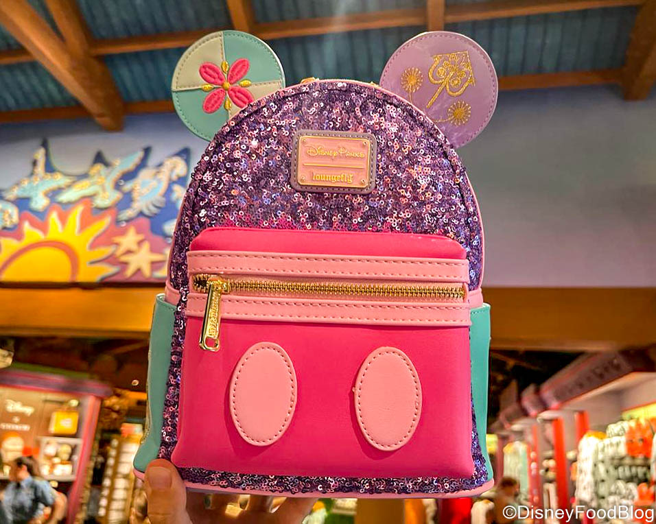 Disney’s been releasing Mickey Mouse merchandise inspired by various iconic rides, like Space Mountain, Mad Tea Party, “it’s a small world“, Pirates of the Caribbean, Enchanted Tiki Room, and Peter Pan’s Flight. Each attraction’s set of merchandise is part of the Mickey Mouse: The Main Attraction collection. And while some of the items can be found around Disney World immediately upon the set’s release, others take time to arrive — like the Loungefly Backpack from the “it’s a small world” collection. And, speaking of, we found that backpack in Disney’s Animal Kingdom recently!