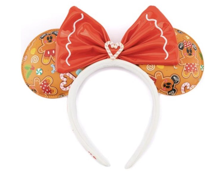 These ears have a white headband and brown ears with Mickey and Minnie gingerbread cookies, plus candy canes, and other holiday decorations. The bow is red with two candy canes in the shape of a heart in the center. You can grab this pair of ears right now for $30 (and they’re in stock!).