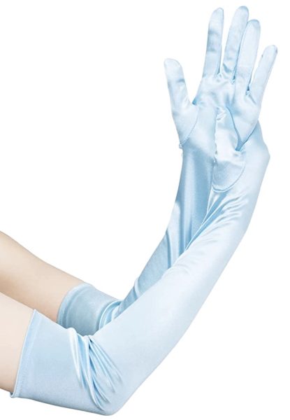 We found these light blue satin gloves on Amazon that would be perfect! They are elbow-length and described as light and breathable. You can grab them for $9.59.