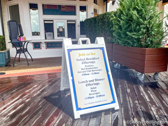 The sign indicated that, in the meantime, guests could stop by a variety of other spots on the BoardWalk for a snack. BoardWalk Pizza Window will be offering breakfast sandwiches, pastries, and more during breakfast time, and there will be pizzas and salads (as usual) during lunch/dinner.