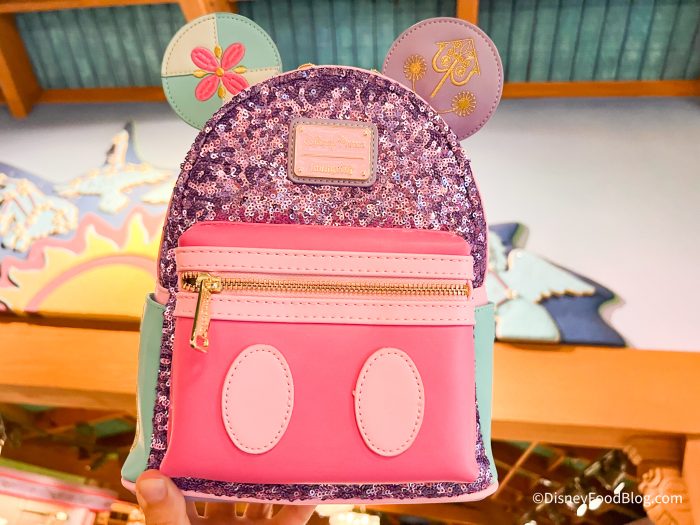 The bag itself is a mixture of pastel colors like pink, blue, and purple, with sequins and the iconic “it’s a small world” face on one of the two Mickey ears. You can grab this bag for $85.