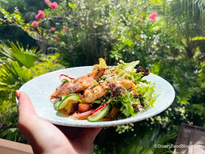 Let’s start with the food! Nomad Lounge, the lounge connected to Tiffins has gotten two newer menu items. First up is The Land salad, which is available for $12 without protein, $22 with protein. The salad has been available at Tiffins for a while as an appetizer but is a newer addition over at Nomad Lounge. Fun fact: it utilizes produce grown at EPCOT’s Living with the Land!