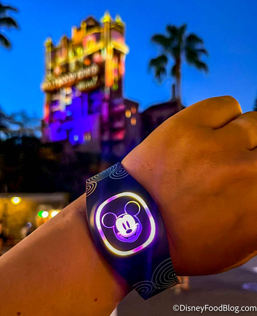 We visited Disney’s Hollywood Studios to see how the MagicBand+ interacts with the Tower of Terror Beacon of Magic! In case you don’t remember, the Tower of Terror is lit up nightly in honor of Disney World’s 50th anniversary, and the show begins at nightfall with a sequence of colorful lighting until finally displaying the gorgeous lighting you see below. Disney has said that the MagicBand+ will engage with all four Disney Park icons as they transform into Beacons of Magic.