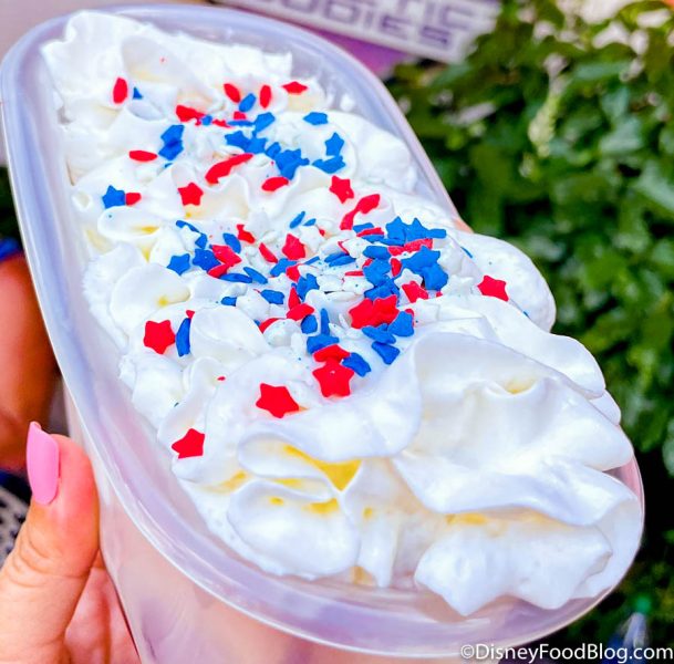 It’s actually chocolate and vanilla soft-serve, brownie pieces, hot fudge, and whipped cream topped with red, white, and blue sprinkles served in a “bathtub,” to be more specific.