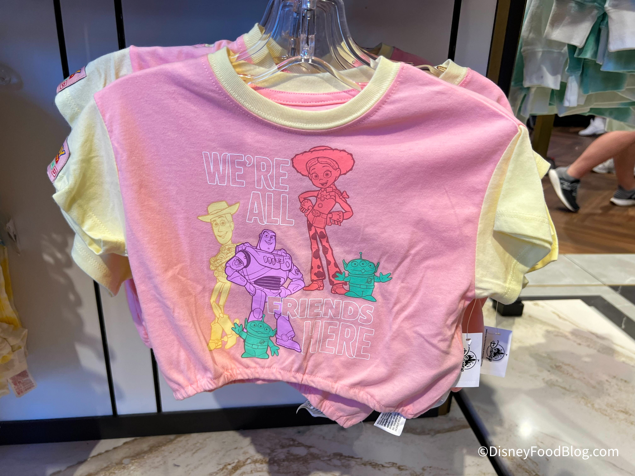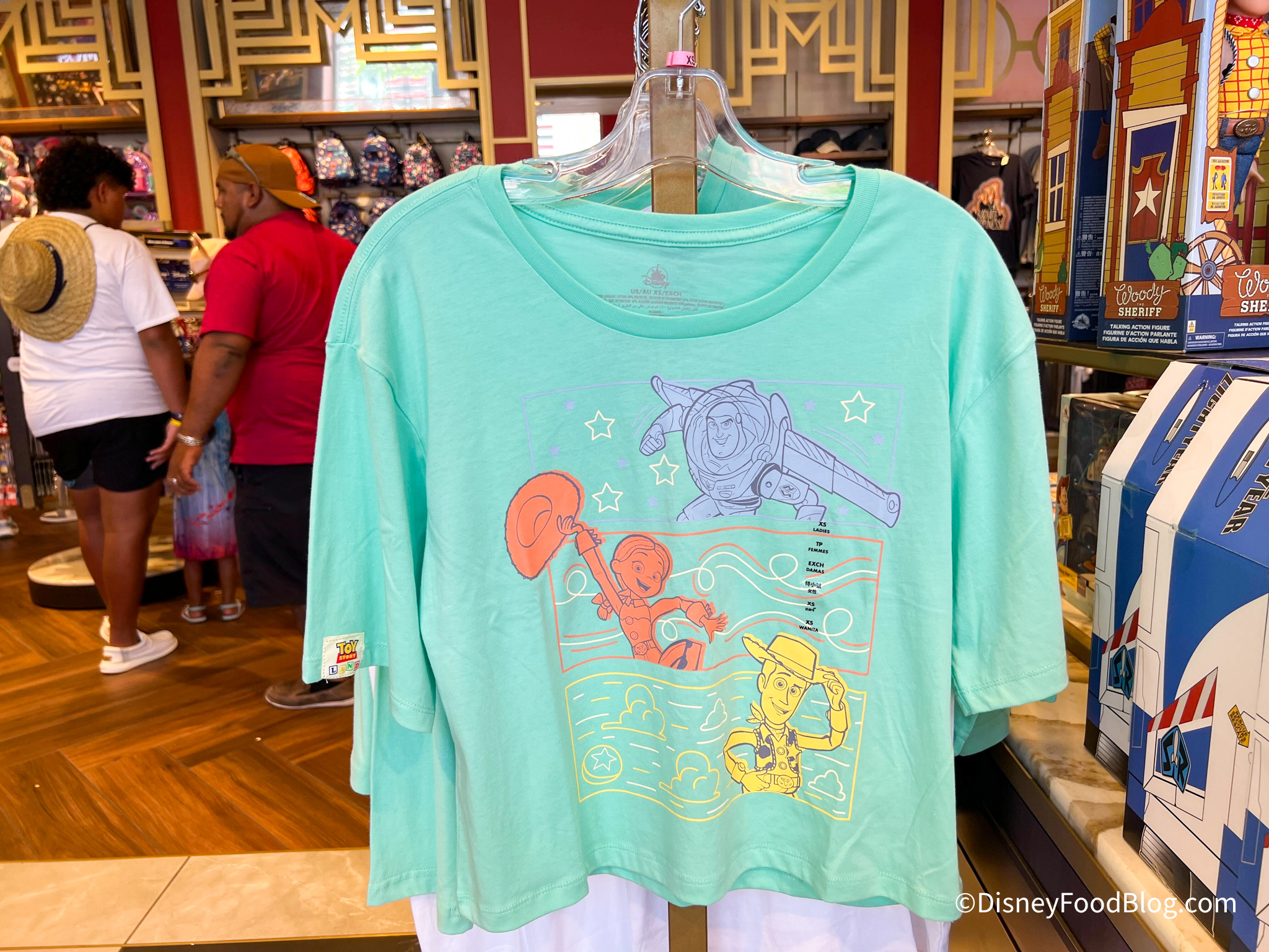 Here, we found tons of new Toy Story items. There was this crop top for $29.99 that is a blue/green color and has Woody, Buzz, and Jessie on it.