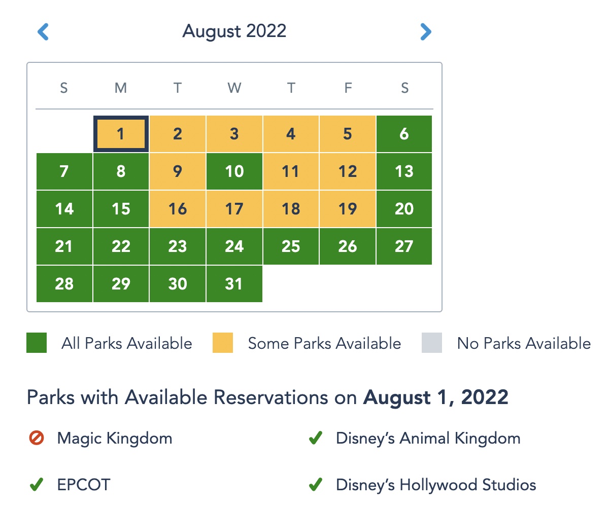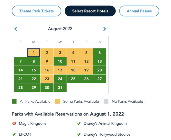 Magic Kingdom is also the only park sold out on that Monday, though both Magic Kingdom and Hollywood Studios are sold out on Tuesday. On Wednesday, it’s just Magic Kingdom unavailable again, and both Magic Kingdom and Hollywood Studios are unavailable again on Thursday. On Friday, all parks are available except for Hollywood Studios, and Saturday has open availability for each park.