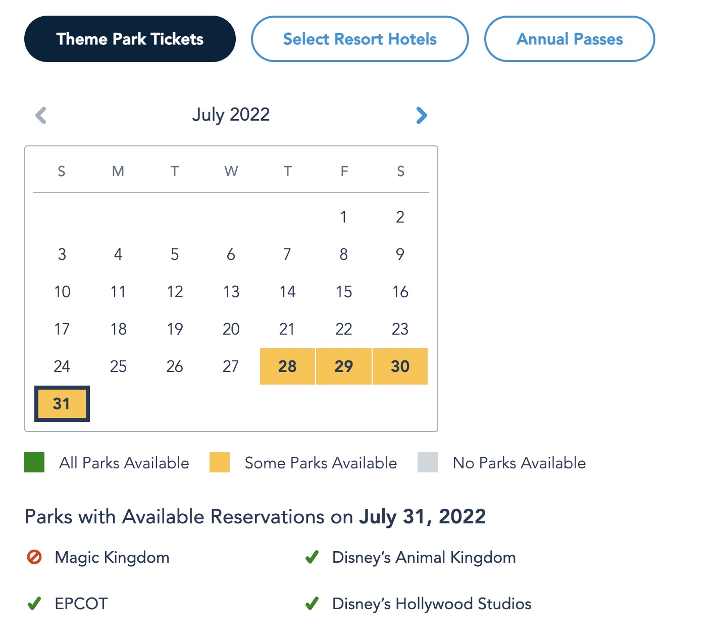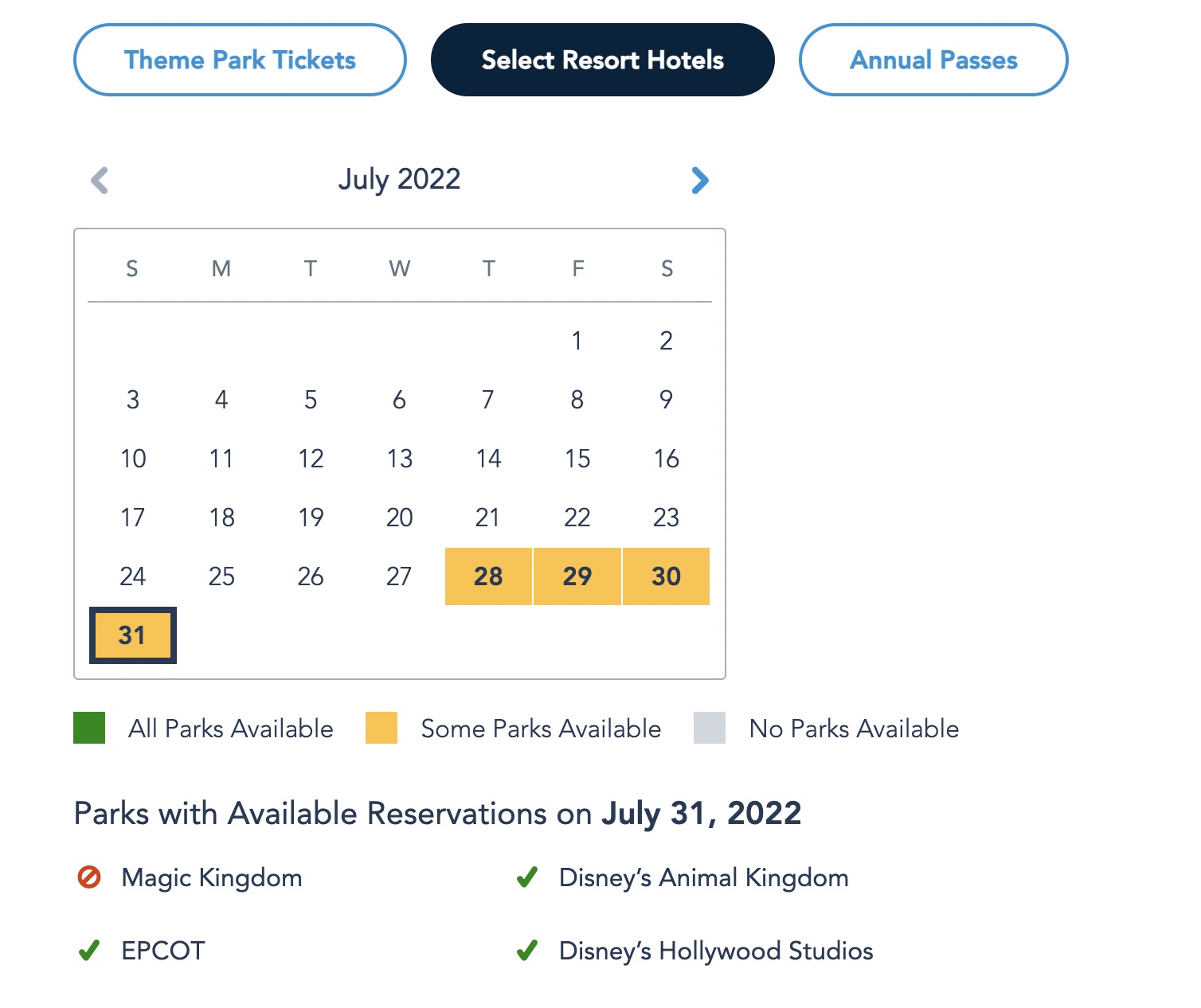On Sunday, July 31st, the only park sold out for select hotel guests is Magic Kingdom.