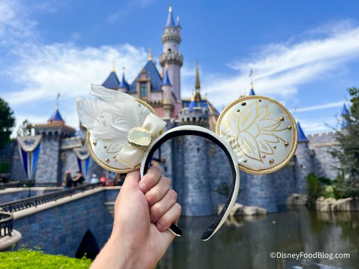 We also spotted these incredibly intricate and detailed Princess Tiana White Lotus Flower Ears. They are white with gold detailing and lotus flowers on the ears themselves. The headband’s ears are white with gold piping around the outside and gold studs surrounding the flower. This is a unique take on Princess Tiana, because items that are inspired by her are often green where these are white and gold!