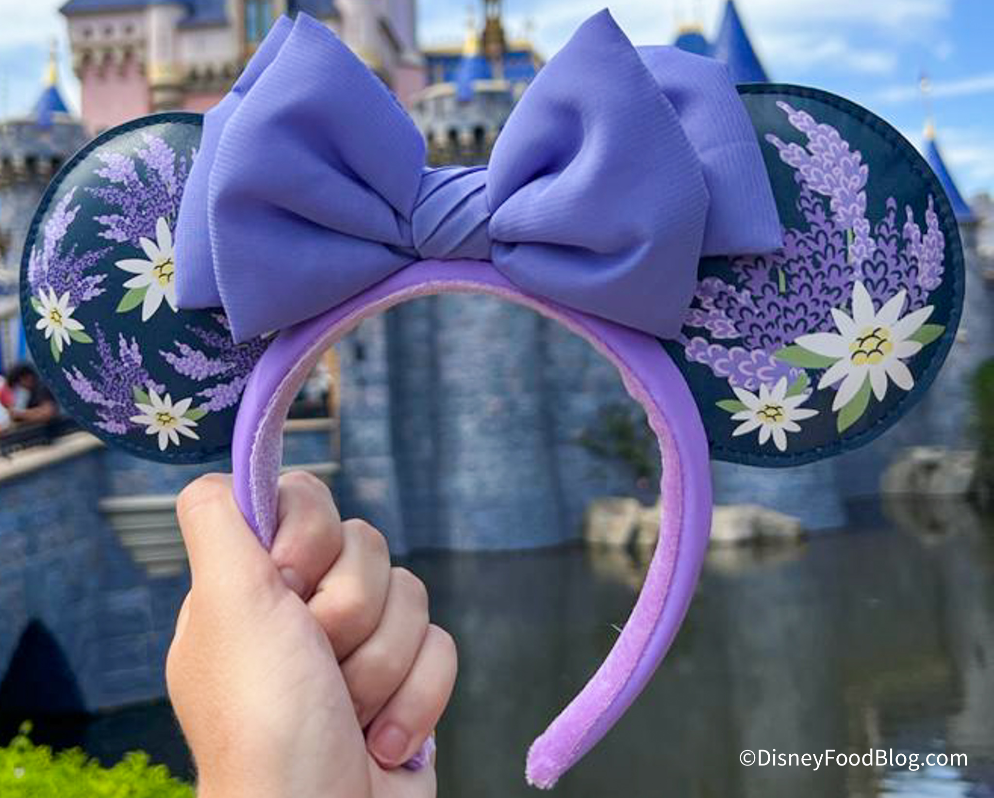 First up, we have these Purple Flower Ears! This pair has a light purple headband with ears that are dark purple and feature purple and white flowers.
