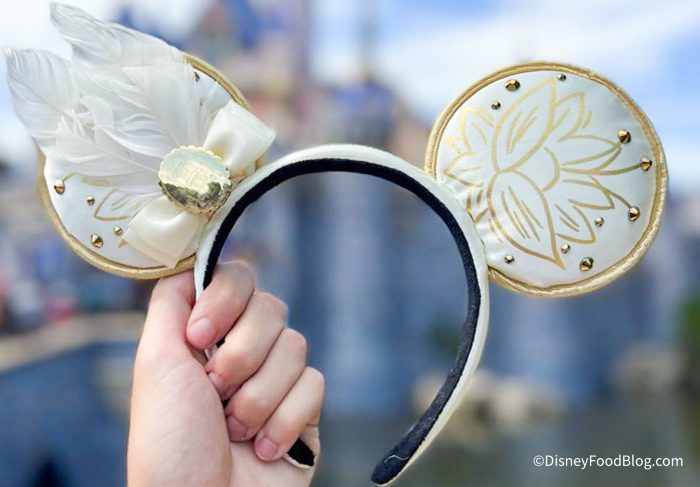 Instead of a bow in the center of the headband, these ears have a small bow with a huge white feather offset on the left side.The Princess and the Frog is set in the 1920s, so the feather is very on-brand for the time period. There is a small gold charm in the center of the bow.