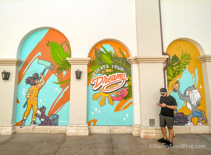 There’s a new mural over near the bus lot and restrooms as part of the Disney Springs Art Walk! It has some serious tropical summer vibes, features a familiar Disney character’s backside, and has the positive message, “Create Your Dreams.”