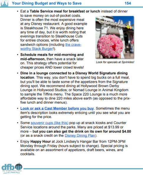 In our DFB Guide to Walt Disney World Dining 2023, there’s an entire section on Disney Dining Discounts. There, you can find several ways to save money on food during your vacation. From coupons to membership savings to apps, there are all kinds of options to get you every possible discount.