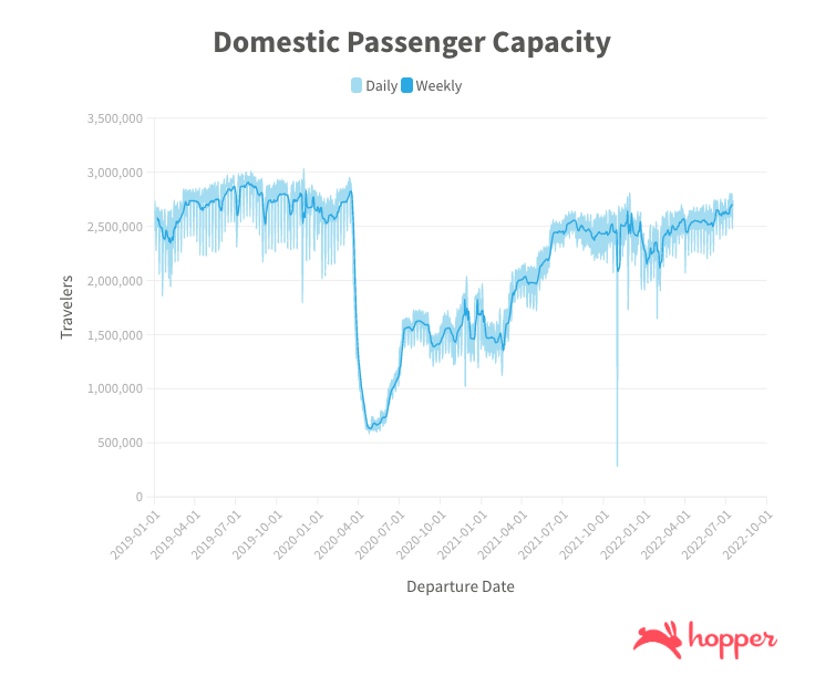 Capacity has also been cited as a factor for lower airfare, as many airlines have proactively reduced their schedules for the year. Because of this, Hopper predicts capacity will not fully recover until summer 2023 — meaning fewer seats available to book this year despite high demand for summer and holiday travel.