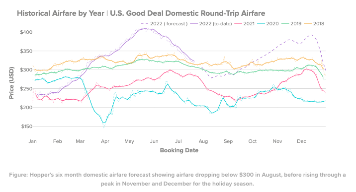 Domestic airfare will drop 25% this fall, according to travel app Hopper. In August, we could see average fares as low as $286 — a far cry from the peak in May earlier this year. Hopper also predicts that costs will remain at or below $300 through September, but will then pick back up in October and November.