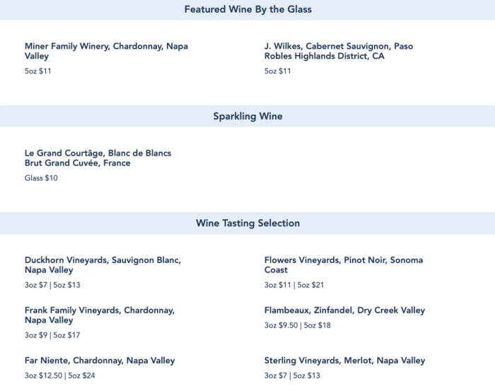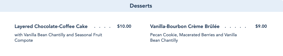 And of course, for dessert at Blue Bayou, you can choose between a Layered Chocolate-Coffee Cake and a Vanilla-Bourbon Crème Brûlée.