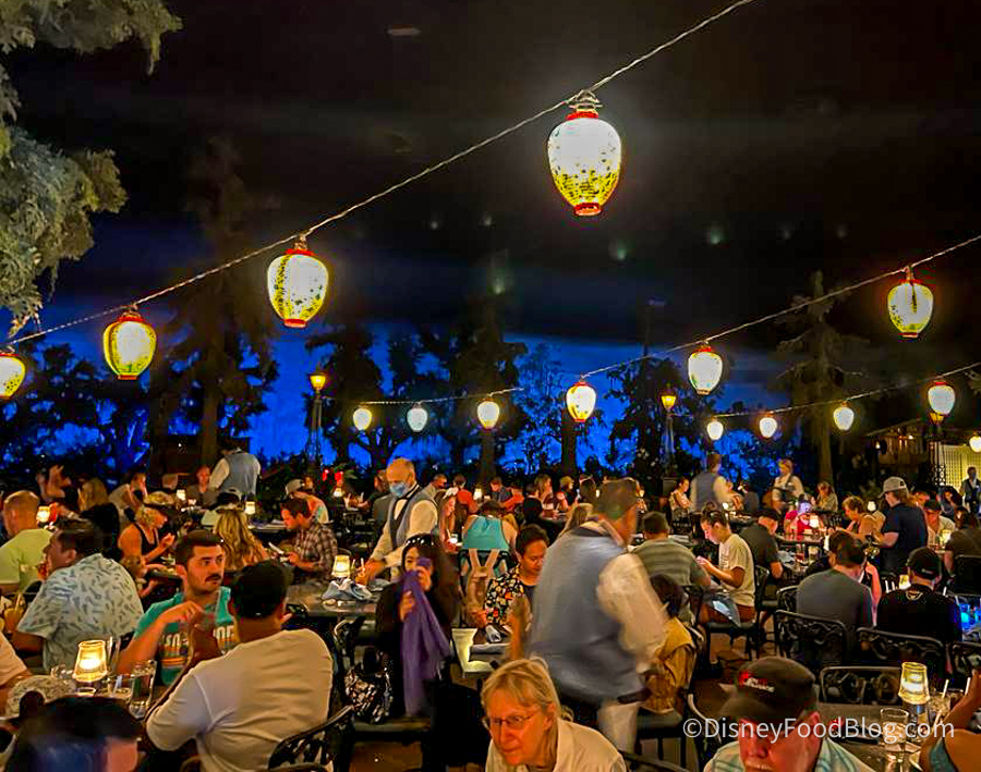 Guests dine in a courtyard setting at tables with wrought-iron chairs, and hanging paper lanterns dot the “night sky” above.