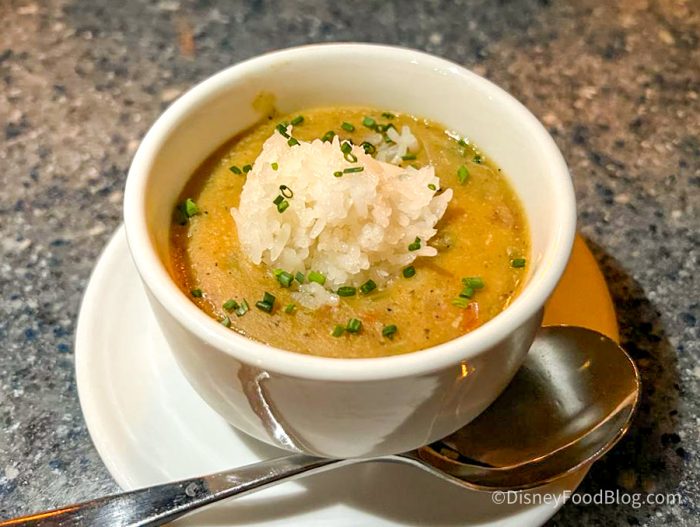 We decided to start off with a New Orleans classic — gumbo! The Chicken Gumbo at Blue Bayou is made with Tasso Ham, Andouille Sausage, Peppers, and Tomatoes with Steamed Rice, and you can get a cup for $7.