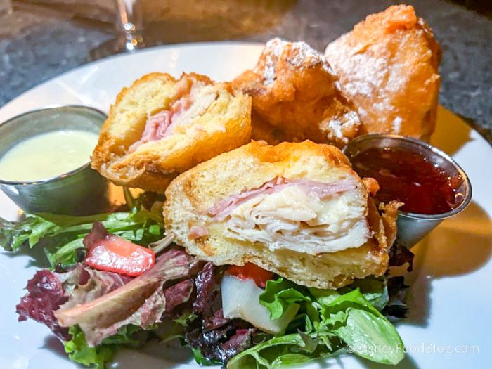 For our lunch, we ordered the classic Monte Cristo and Seasonal Salad — a Battered and Fried Turkey, Ham, and Swiss Sandwich served with a Market Fruit Salad and Seasonal Preserves. We will say, this is a HEAVY dish — so keep that in mind if you still have an entire park day ahead of you.