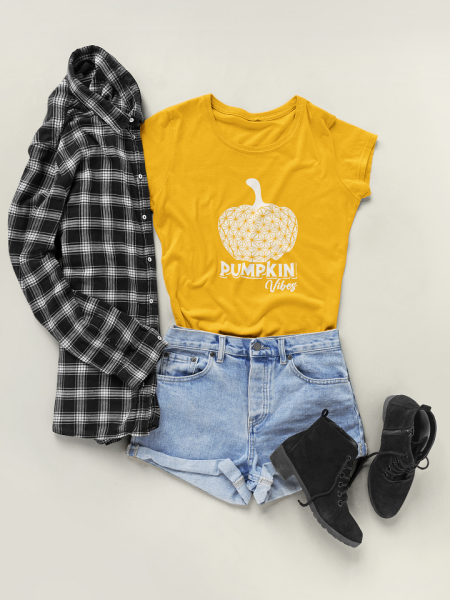 NOTE: There are TWO versions available — you can snag this white Spaceship Earth pumpkin vibes shirt with orange writing like you see in the flatlay above. OR you can go colorful and grab the regular Spaceship Earth pumpkin vibes shirt in all the colors you love (like the one below)!